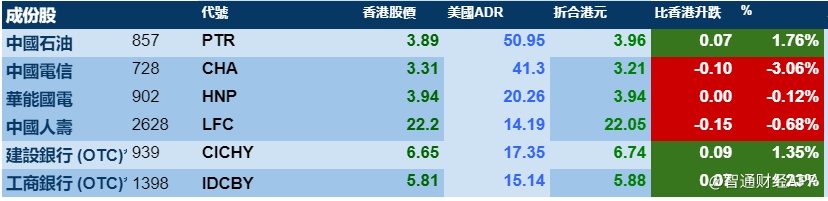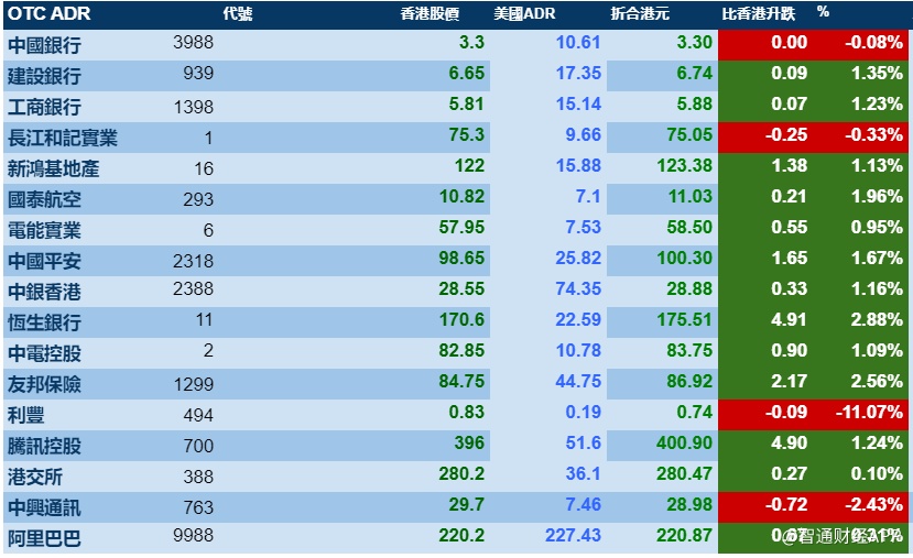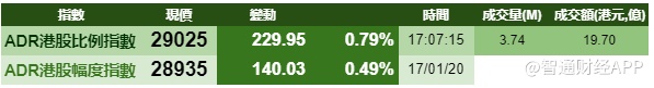 智通财经APP获悉,周一美股休市,港股ADR指数走高,按比例计算,收报29025点,升0.79%。大型蓝筹全线向好,汇丰控股收报60.24港元,较港收市升0.29港元;腾讯控股收报400.90港元,较港收市升4.90港元。
