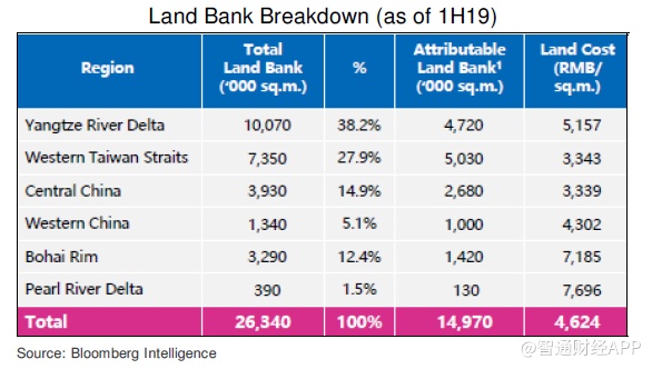 正荣在2019年收购约38块新地块,建筑面积约450万平方米,土地金额约310亿,权益土地金额约250亿。这些土地大多位于二线城市,例如南京、合肥、武汉、西安、成都、重庆、天津、福州和南昌。 2019年的土地储备为2600万平方米,其中超过70%位于一、二线城市,足够公司未来2.5年的销售。鉴于二线城市的土地增加,新购土地每平方米成本6450元。公司整体平均土地成本为每平方米人民币4700元,相对合约销售价格每平方米15500元,我们认为是相对合理的。位于长三角和海峡西岸的土储占总土储的三分之二。而近期放松的户口政策也会支持公司在三线城市的业务发展。