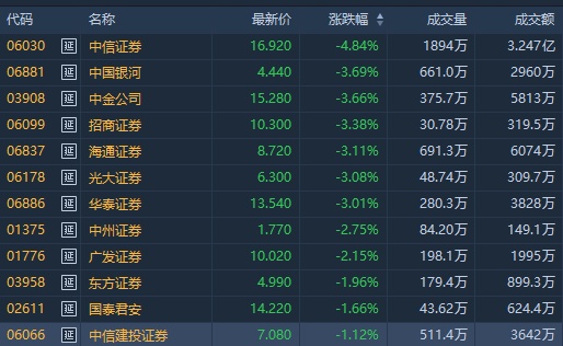 截至发稿,中信证券(06030)跌4.95%,报16.9港元;中国银河(06881)跌3.9%,报4.43港元;中金公司(03908)跌3.91%,报15.24港元;华泰证券(06886)跌3.3%,报13.5港元;国泰君安(02611)跌1.8%,报14.2港元。