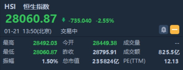 智通财经APP获悉,恒生指数午后跌幅扩大逾700点,考验两万八千点大关,成分股全线下挫,友邦保险(01299)及腾讯(00700)均拖累指数接近百点。截至13时50分,恒指跌735.04点或2.55%,报28060.87点,成交额暂为825.5亿。