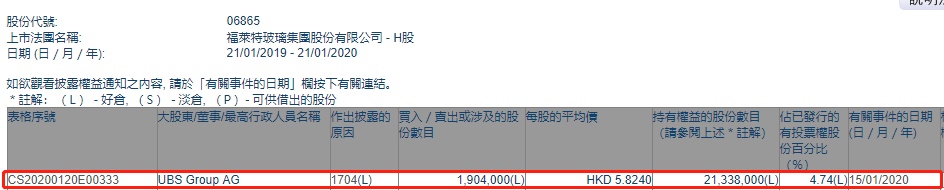 智通财经APP获悉,联交所最新资料显示,1月15日,瑞银减持福莱特玻璃(06865)190.4万股,每股作价5.824港元,总金额约为1108.89万港元,减持后最新持股数目约为2133.8万股,最新持股比例为4.74%。