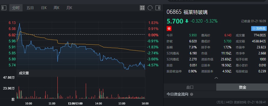 截至今日收盘,福莱特玻璃跌5.32%,报5.70港元。