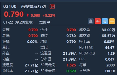 智通财经APP获悉,百奥家庭互动(02100)发布公告,预期年度收入约人民币6.6亿元至人民币7.5亿元,同比增加约132.0%至163.6%。该股早盘高开,截至发稿,涨8.22%,报0.79港元,成交额65.57万港元。