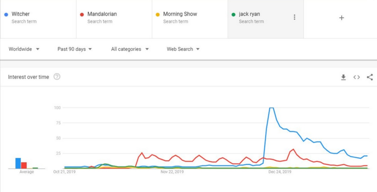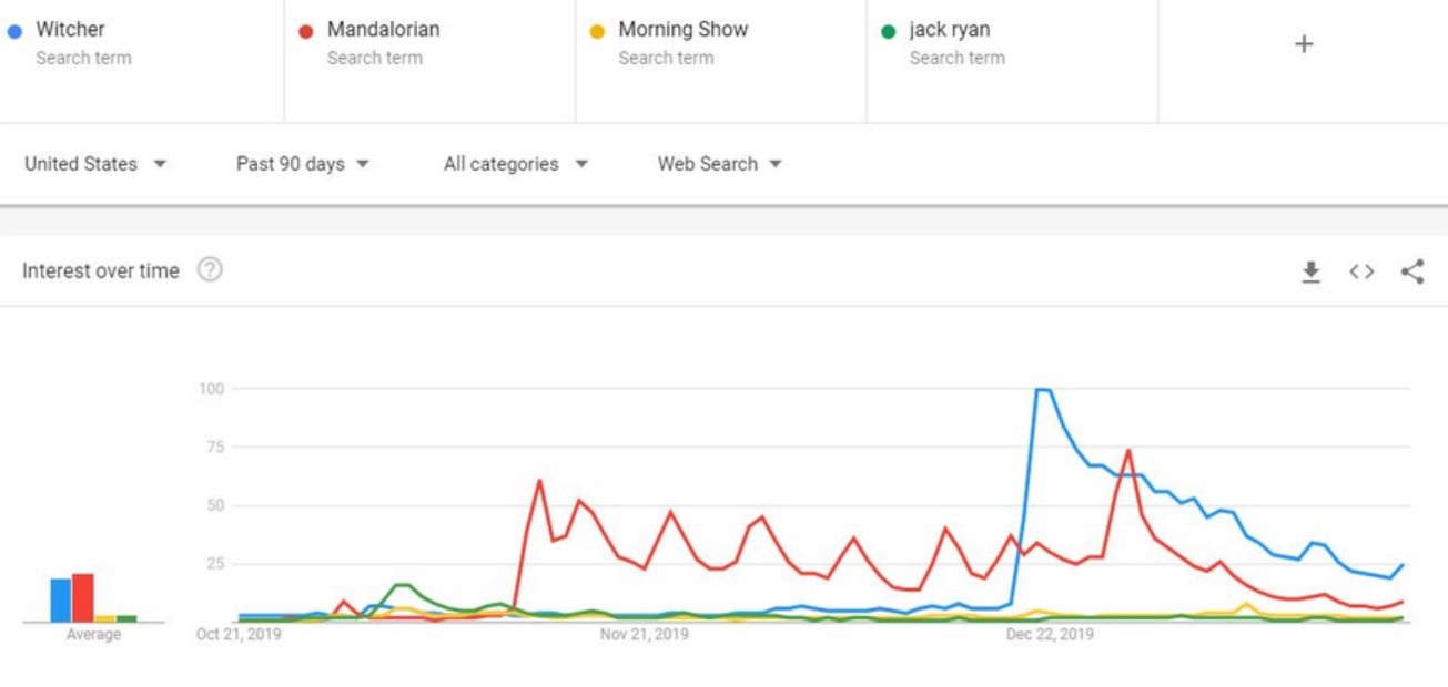 因此该图表并不算非常客观。若使用相同的搜索条件,并将搜索范围限制在美国内的话,《曼达洛人》的表现可比《巫师》强多了。