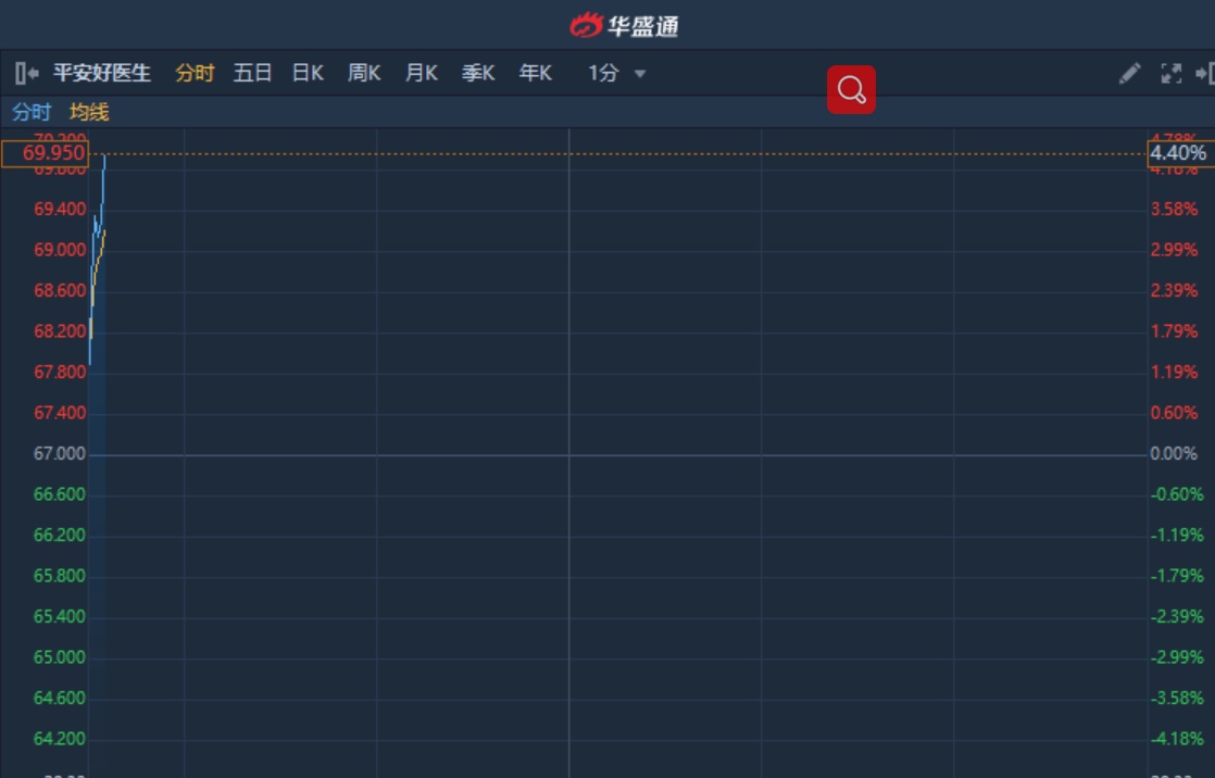 智通财经APP获悉,平安好医生(01833)延续升势,早盘急升逾4%,再度刷新历史新高,股价逼近70港元,截至9时35分,涨4.33%,报价69.9港元,成交额5266万。