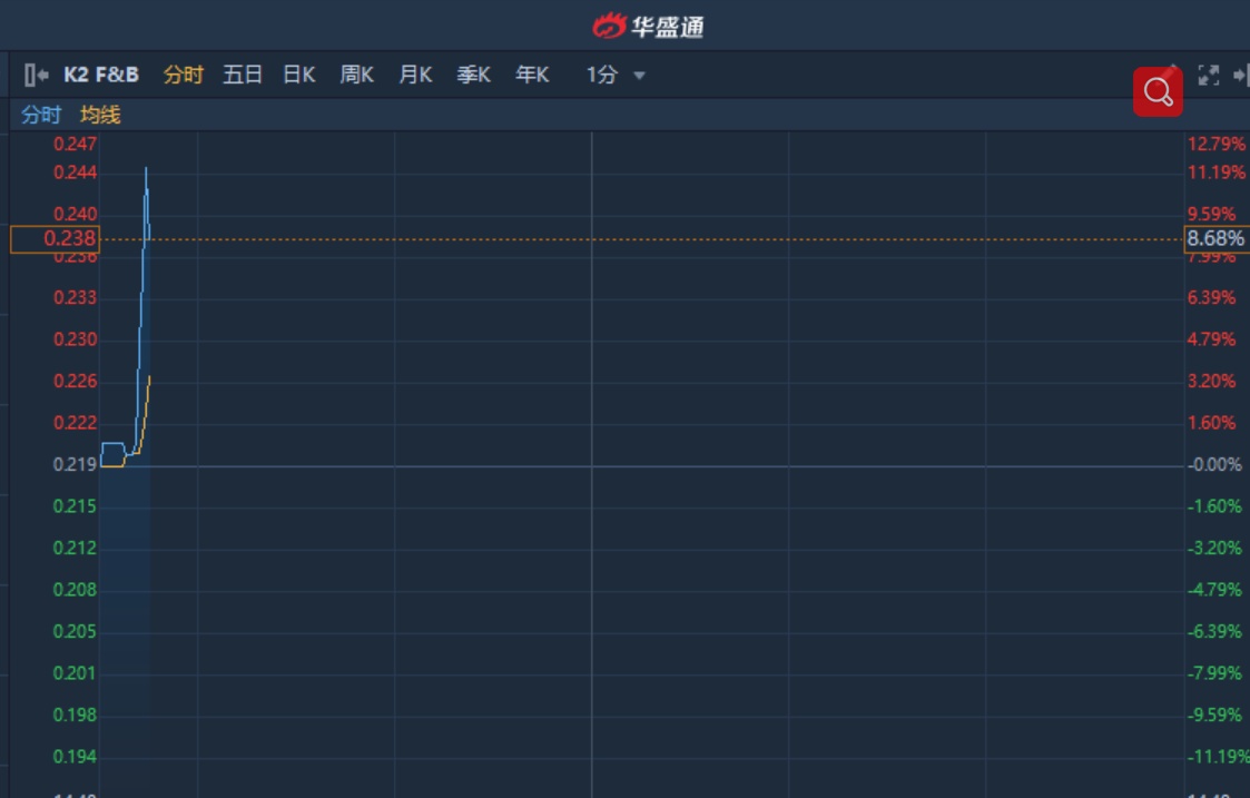 智通财经APP获悉,K2 F&B(02108)正讨论收购一项物业,今日复牌,盘中股价无量上涨,截至9时44分,涨8.68%,报价0.238港元,成交额5.8万。