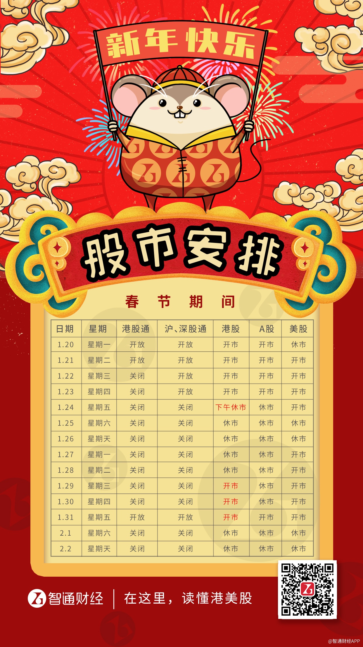 智通财经APP获悉,2020年春节期间,港股1月24日(除夕)下午起至1月28日休市,1月29日(初五)开市,港股通1月22日至1月30日(初六)关闭,1月31日(初七)开放。