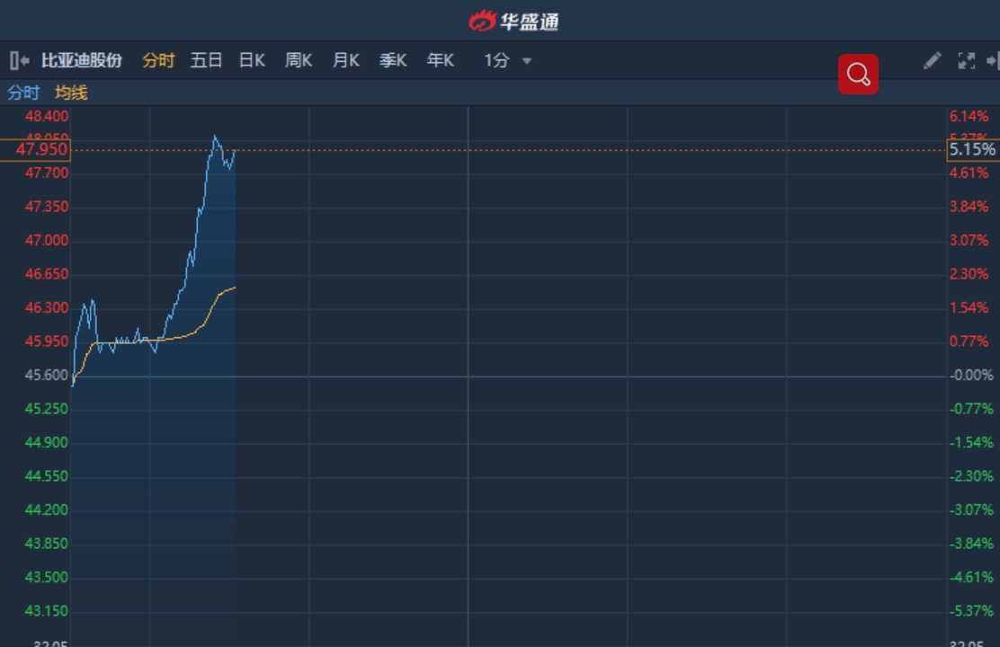 智通财经APP获悉,比亚迪股份(01211)昨日盘后公告称,控股子公司拟对腾势新能源增资3.5亿人民币。该股盘中放量急升,截至10时31分,涨5.15%,报价47.95港元,成交额1.886亿。