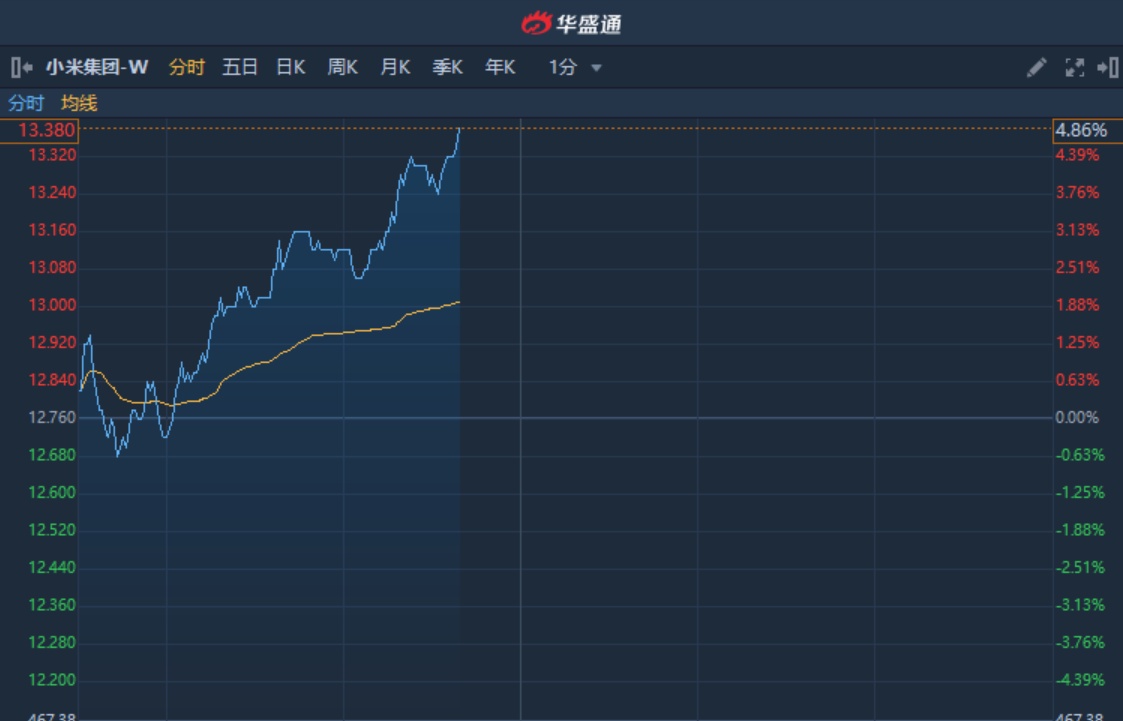 智通财经APP获悉,小米(01810)盘中股价放量上扬,总市值达3200亿港元。截至11时38分,涨4.86%,报价13.38港元,成交额16.5亿。值得一提的是,该股月初至今累计涨幅达23.75%。