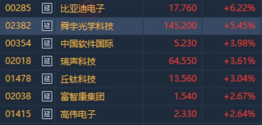 智通财经APP获悉,手机产业链午后全线爆发,比亚迪电子(00285)涨幅扩大逾6%,暂领涨板块。截至13时40分,比亚迪电子(00285)涨6.22%,报价17.76港元,舜宇光学(02382)涨5.45%,报145.2港元。中软国际(00354)涨3.98%,瑞声科技(02018)涨3.61%。