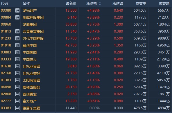 截止发稿,龙光地产(03380)涨5.29%,报13.54港元;龙湖集团涨4.05%,报35.95港元;世贸房地产涨4.1%,报29.2港元;旭辉(00884)涨3.89%,报6.14港元;绿城中国(03900)涨3.7%,报10.66港元。