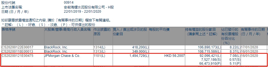 智通财经APP获悉,联交所最新资料显示,1月16日,小摩增持海螺水泥(00914)149.4729万股,每股作价56.2007港元,涉及总金额约为8400.48万港元。增持后最新持股数目约为9209.64股,最新持股比例7.08%。