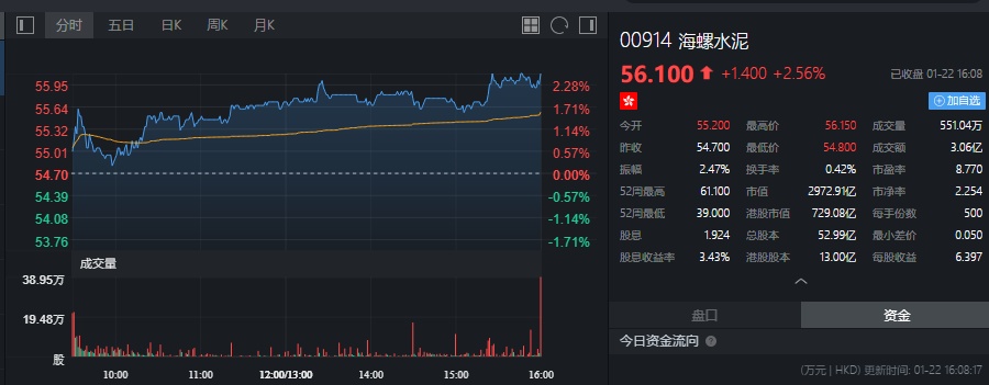 截至今日收盘,海螺水泥涨2.56%,报56.10港元。