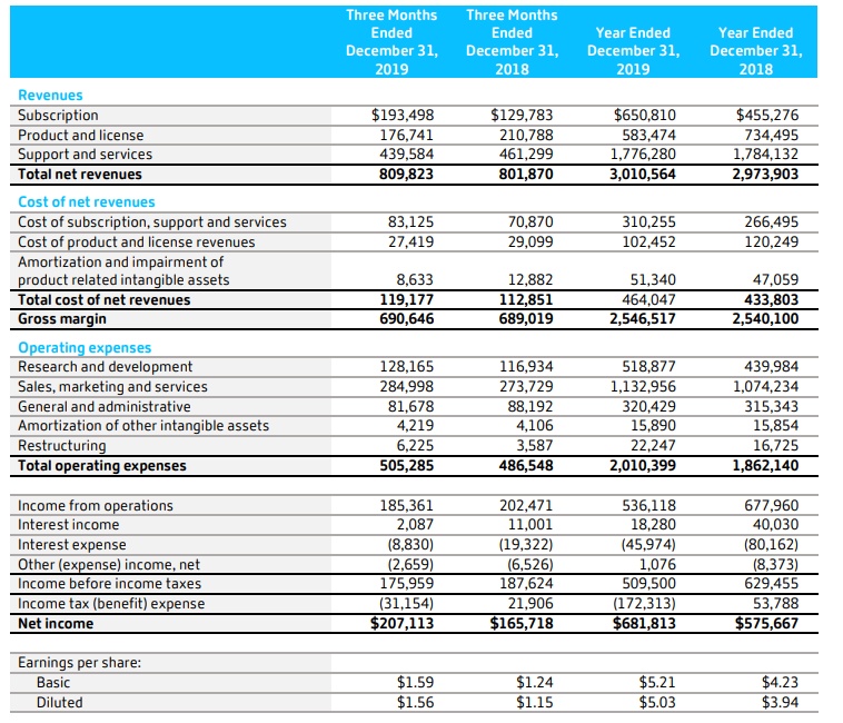 全年净利润为6.81亿美元,同比增长18%。摊薄后每股收益为5.03美元,高于去年同期的3.94美元。非GAAP下,思杰全年净利润为7.62亿美元,摊薄后每股收益为5.69美元,达到其预期收益的指导上限(5.6-5.7美元)。