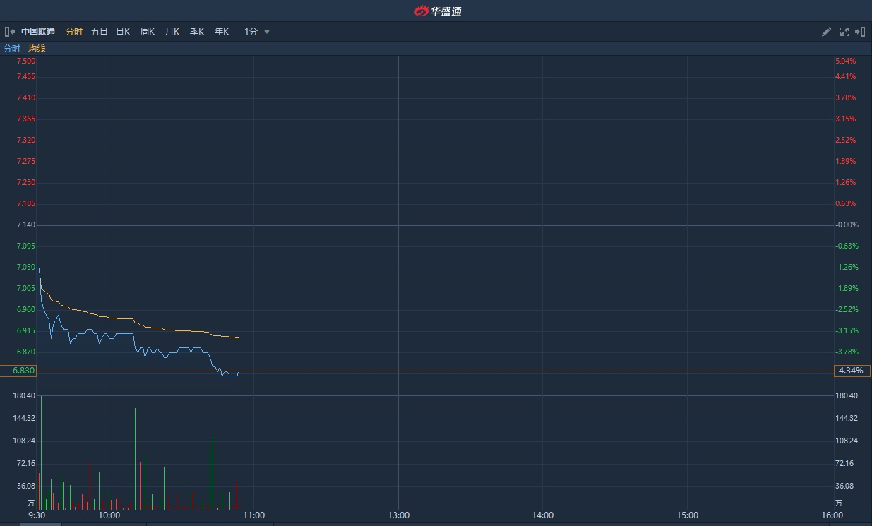 智通财经APP获悉,中金公司发表研究报告指,中国联通(00762)2019年净利润预计约113亿元人民币,按年升约11%,低于该行预估。受此影响,中国联通跌逾4%。截止发稿,跌4.48%,报6.82港元,成交额1.46亿港元。