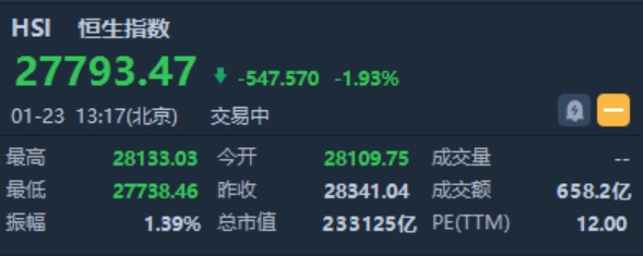 智通财经APP获悉,恒指午后跌幅再度扩大,跌超500点。恒指反向杠杆产品获市场资金追捧,逆市上扬。截至13时17分,恒指跌547.57点或1.93%,报27793.47点,成交658.2亿。