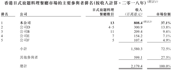 根据灼识咨询报告数据显示,香港日式放题料理市场2018年前五大参与者合共占据了约72.5%的市占率,是个已经较为集中的市场。其中大喜屋营运的13间日式放题料理餐厅,以收入8.08亿港元(单位下同)排名市场第一,占有约37.1%的市场份额,远远超过第二名13.8%的市占率水平。
