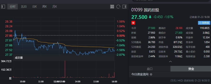 截至今日收盘,国药控股跌1.61%,报27.50港元。