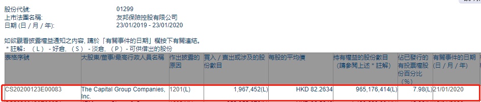智通财经APP获悉,联交所最新资料显示,1月21日,The Capital Group减持友邦保险(01299)196.7452万股,每股作价82.2634港元,总金额约为1.62亿港元,减持后最新持股数目约为9.65亿股,最新持股比例为7.98%。