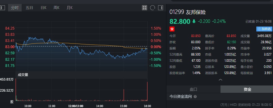 截至今日收盘,友邦保险跌0.24%,报82.8港元。