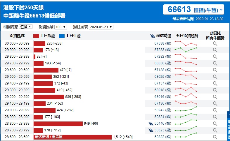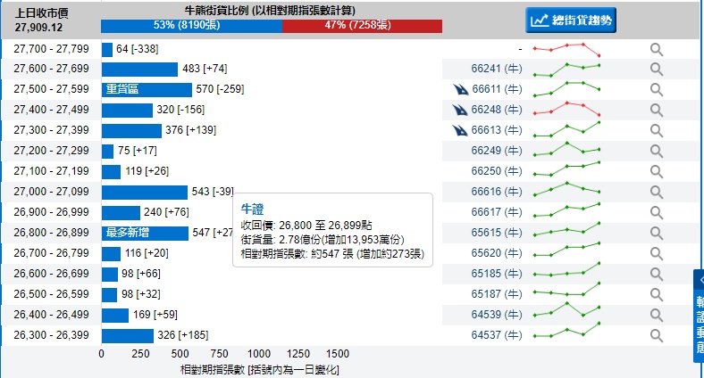 智通财经APP获悉,截至1月24日,恒指最新的牛熊街货比例53:47。瑞信恒指牛熊证街货分布图中的数据显示,熊证街货重货区在28600-28699区间,该区间最新熊证数量为1512张,较上一交易日增加540张,最多新增也在此区间。牛证街货重货区在27500-27599区间,该区间最新牛证数量为570张,较上一交易日减少259张,最多新增在26800-26899区间,该区间最新牛证数量为547张。