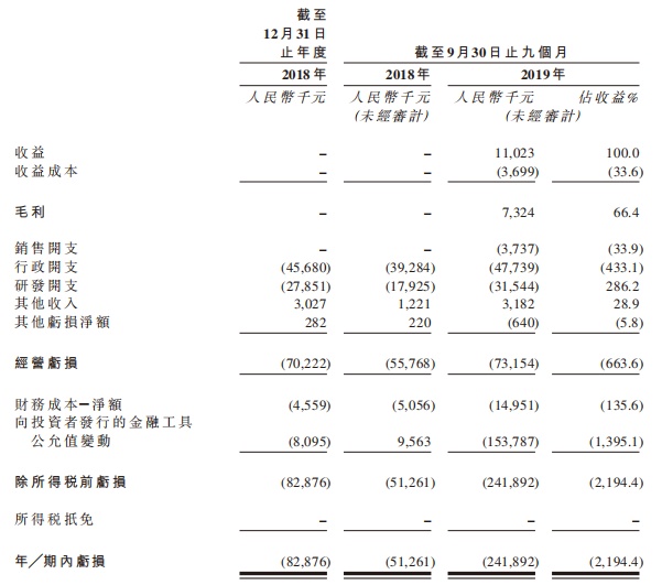 沛嘉医疗仅于2019年3月收购加奇后开始确认收益且产生收益成本以及销售开支。亏损净额由截至2018年9月30日止九个月的人民币5126.1万元大幅增加至截至2019年9月止九个月的人民币2.42亿元,主要由于截至2019年9月止九个月向投资者发行的金融工具重大公允值变动人民币1.54亿元所致。