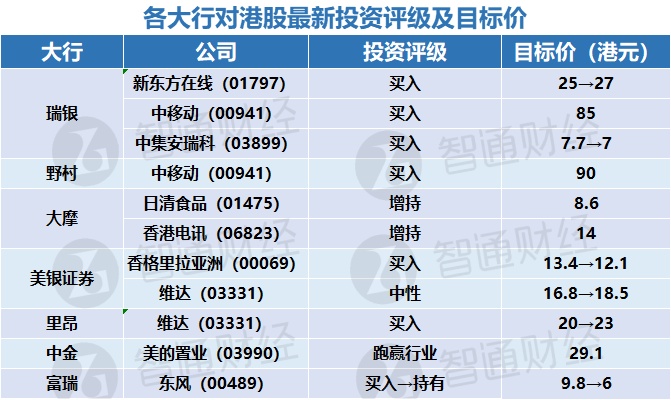 各大行对港股最新投资评级及目标价