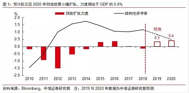我们认为长期低利率政策的刺激作用可能也没有市场预期的那么强,而财政政策有必要也有能力进一步刺激欧洲经济。根据我们的测算,基准情形下欧元区2020年财政政策将小幅扩张,其力度相当于GDP的0.4%(图1),其中德国财政扩张空间最为明显(相当于GDP的0.7%)。考虑到发达国家的财政乘数普遍在0-1之间,财政政策的扩张有望拉动GDP增速回升0.2%,预计明年欧元区GDP增长1.2%。在政策的对冲下,欧洲经济也将出现弱势回稳。