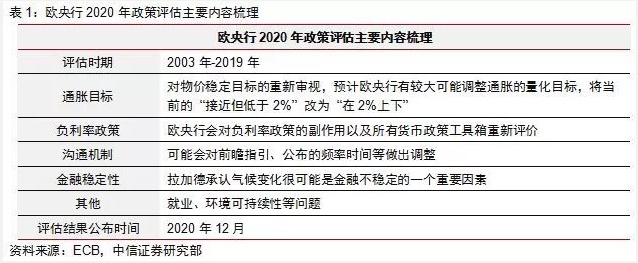 预计首次“政策评估”不改货币政策的宽松取向。欧央行将于今年首次对2003年以来的所有货币政策框架及效果进行重新评估。市场也非常关注此次“政策评估”的细节(表1),其中最值得关注的是对物价稳定目标的重新审视,预计欧央行有较大可能调整通胀的量化目标,将当前的“接近但低于2%”改为“在2%上下”,由单一上限目标改为对称目标制。同时欧央行也会对负利率政策的副作用以及所有货币政策工具箱进行重新审视。整个评估过程预计在今年年底之前完成。