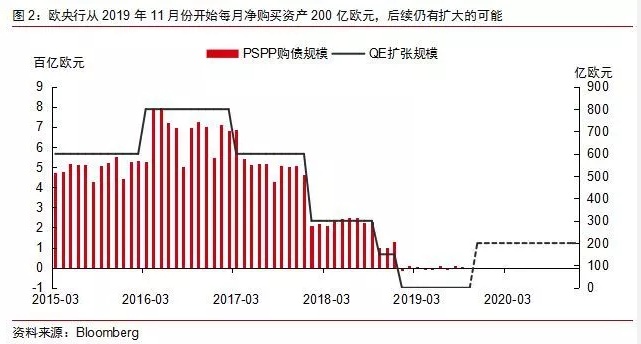 当被问及货币政策的路径是否会受到“政策评估”的直接影响时,拉加德强调货币政策将独立于今年的“政策评估”,随之欧元明显回落,市场对拉加德的发言解读偏鸽派。我们认为此次评估不会在2020年对欧央行货币政策的节奏产生趋势性影响,其货币政策取向依然取决于央行对经济基本面、特别是通胀预期的判断。我们倾向于欧央行仍将维持宽松,预计2020年降息1-2次,全年将继续通过资产购买计划进行扩表(图2),在经济压力加大的情形下可能将购债规模由2400亿欧元提高至3000-4000亿欧元。(编辑:肖顺兰)