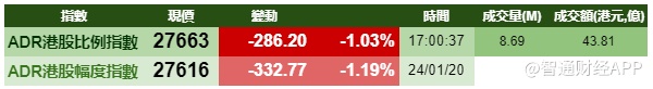 智通财经APP获悉,周五(1月24日)美股大幅受挫,港股ADR指数承压,按比例计算,收报27,663点,跌286点或1.03%。
