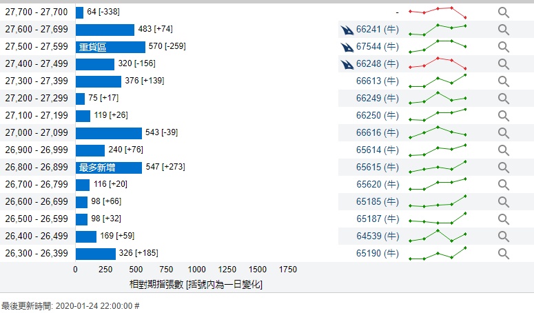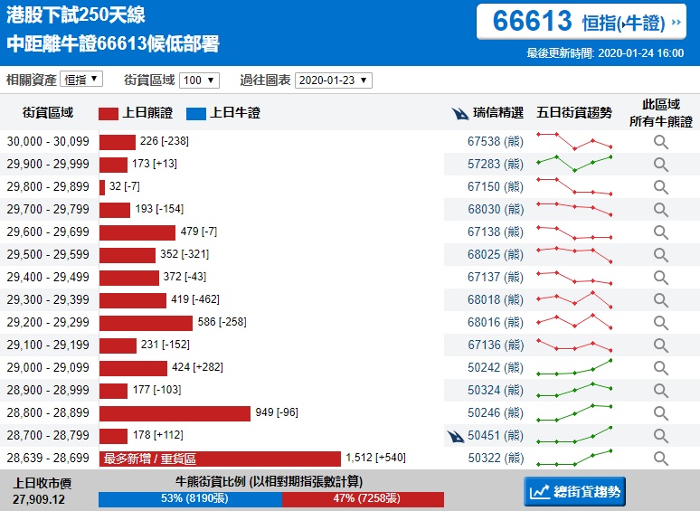 智通财经APP获悉,截至1月25日,恒指最新的牛熊街货比例53:47。瑞信恒指牛熊证街货分布图中的数据显示,熊证街货重货区在28600-28699区间,该区间最新熊证数量为1512张,较上一交易日增加540张,最多新增也在此区间。牛证街货重货区在27500-27599区间,该区间最新牛证数量为570张,较上一交易日减少259张,最多新增在26800-26899区间,该区间最新牛证数量为547张。