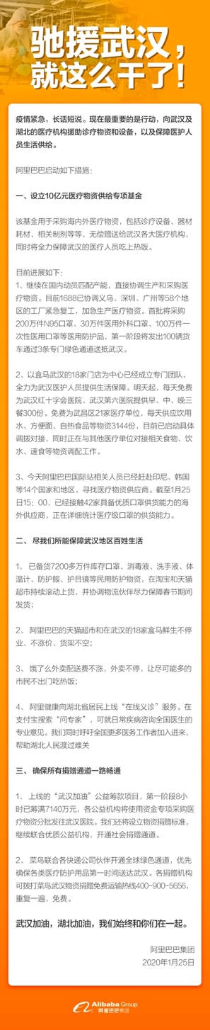 1月24日深夜,上线“武汉加油”公益筹款项目,第一阶段8小时已筹满7140万元,各公益机构将使用资金专项采购医疗物资分批发往武汉医院。阿里巴巴还将设立物资捐赠标准,继续联合优质公益机构,开通社会捐赠通道。