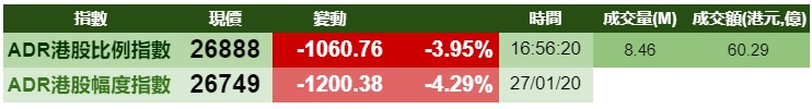 智通财经APP获悉,周一美股大幅受挫,港股ADR指数按比例计算,收报26888点,跌1060.76点或3.95%。