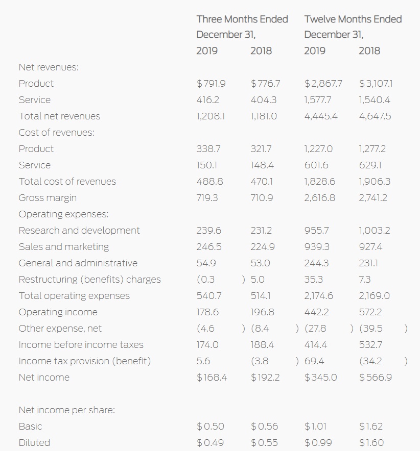 非GAAP下,瞻博网络四季度净利润为1.98亿美元,同比增长19%。摊薄后每股收益为0.58美元,高于去年同期的0.48美元。全年净利润为5.97亿美元,同比降低11%。摊薄后每股收益为1.72美元,高于去年同期的1.88美元。