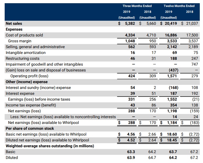 智通财经APP获悉,1月27日美股盘后,全球大型家用电器制造商惠而浦公司(WHR.US)公布了其2019年第四季度及全年财报。