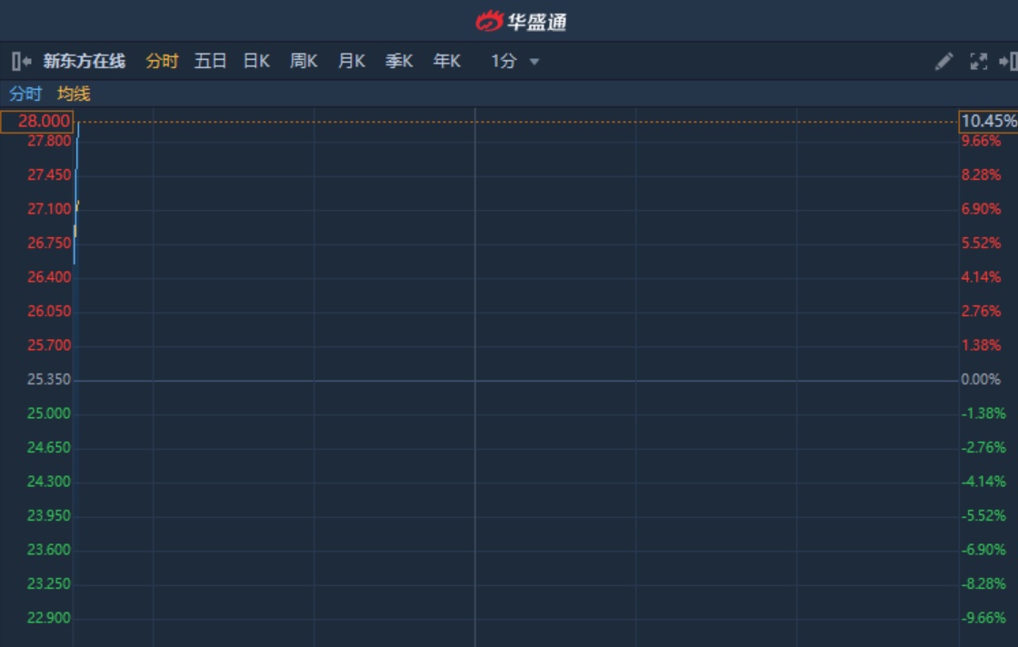 智通财经APP获悉,在线教育股获市场热捧,隔夜美股跟谁学(GSX.US)盘中刷新历史新高。新东方在线(01797)早盘急升逾11%,高见28.4港元,创历史新高。截至9时31分,涨10.45%,报价28港元,成交额1546万。