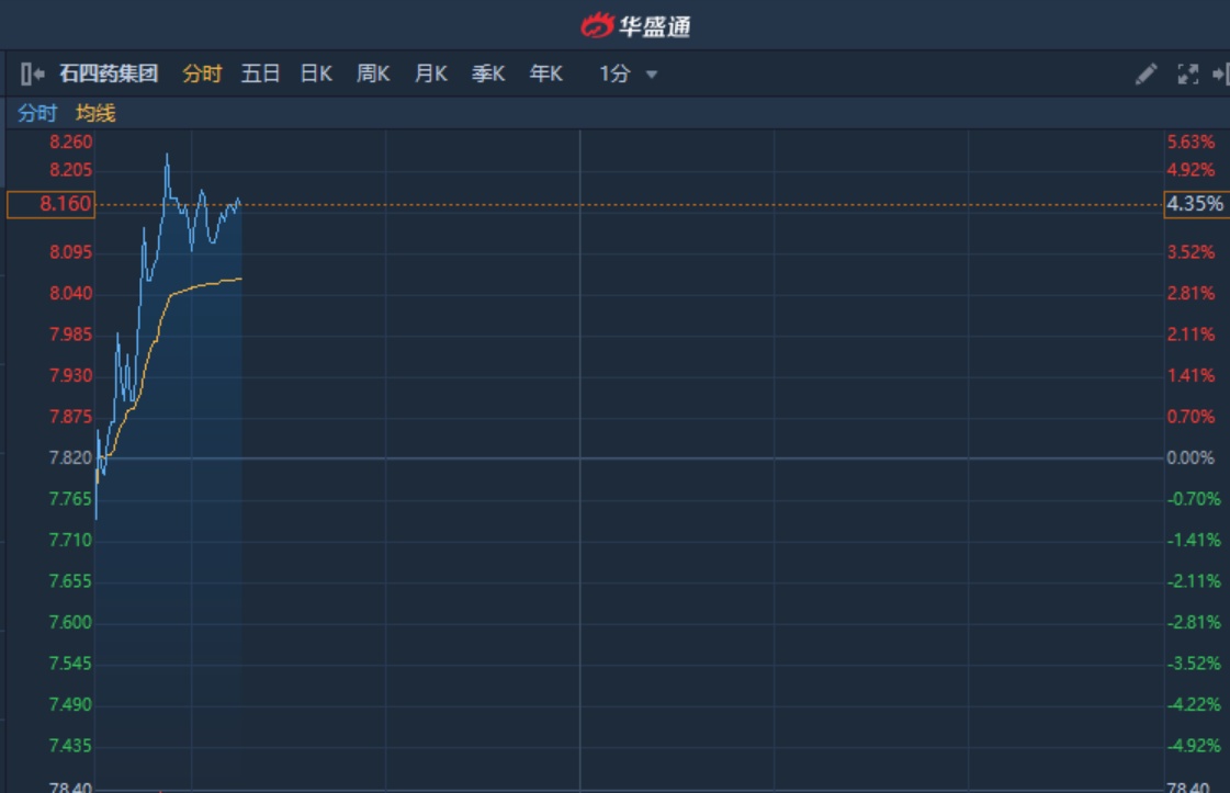 智通财经APP获悉,石四药集团(02005)早盘直线拉涨逾4%,高见8.25港元,创逾52周新高,截至10时14分,涨4.35%,报价8.16港元,成交额6162万。