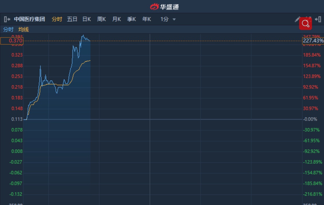 智通财经APP获悉,中国医疗集团(08225)早盘暴涨逾240%,高见0.395港元,创一年半新高,截至10时48分,涨227.43%,报价0.37港元,成交额1019万。