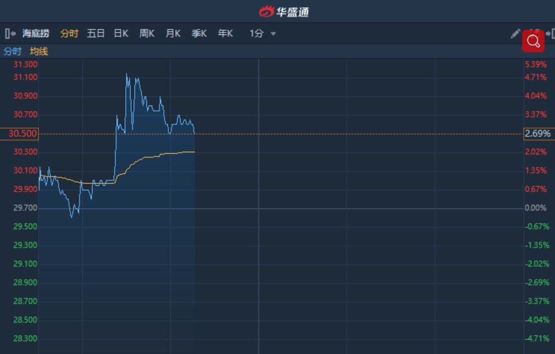 智通财经APP获悉,海底捞(06862)今日高开高走,盘中一度涨超4%,股价逆市上扬。截至11时15分,涨2.86%,报价30.55港元,成交额3.424亿。