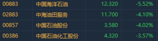 智通财经APP获悉,国际油价月内连续走弱,港股石油板块全线下挫,中海油(00883)领跌板块。截至14时43分,中海油(00883)跌5.52%,报价12.32港元,中石油(00857)跌4.02%,中石化(00386)跌3.57%。