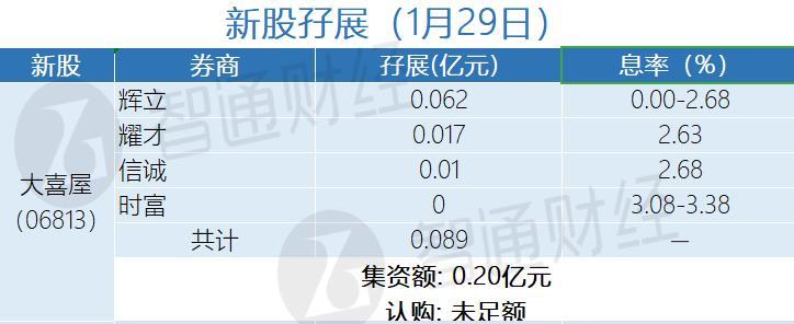 智通财经APP获悉,1月29日,大喜屋(06813)正在招股中。辉立、信诚、耀才和时富共借出0.089亿港元,认购未足额。