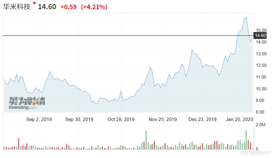 智通财经APP获悉,周三美股盘初,中概股华米科技(HMI.US)股价拉涨,截至北京时间22:46,该股涨4.21%,报14.6美元。