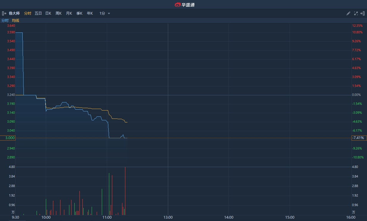 智通财经APP获悉,鲁大师(03601)上市首日曾大涨200%,随后股价持续阴跌。今日盘中挫逾7%,低见2.99港元,较招股价2.7港元仍高一成。截止发稿,跌7.41%,报3港元,成交额121.04万港元。