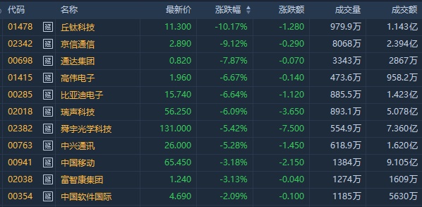 截止发稿,丘钛科技(01478)跌10.17%,报11.3港元;高伟电子(01415)跌9.05%,报1.91港元;比亚迪电子(00285)跌8.07%,报15.5港元;通达集团(00698)跌6.74%,报0.83港元;舜宇光学(02382跌5.78%,报130.5港元。