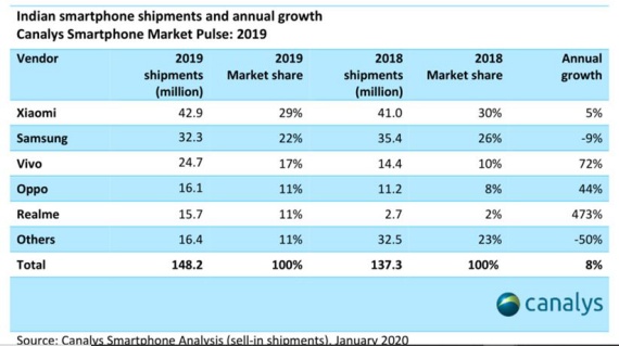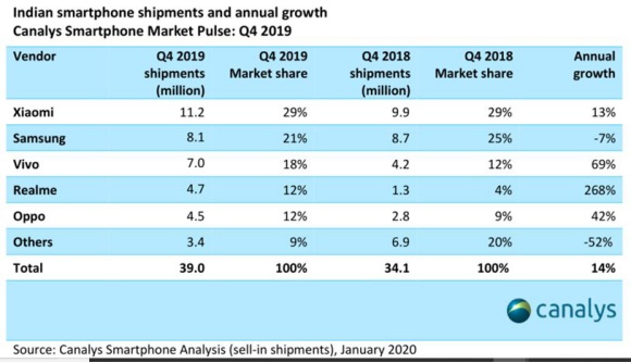 尽管经济放缓继续为市场带来许多不确定性,但印度智能手机市场2019年第四季度增长了14%,总出货量为3,900万台。全年,印度智能手机出货量增长8%,达到1.48亿部。其中,小米智能手机依然成为当地出货量最高的品牌。