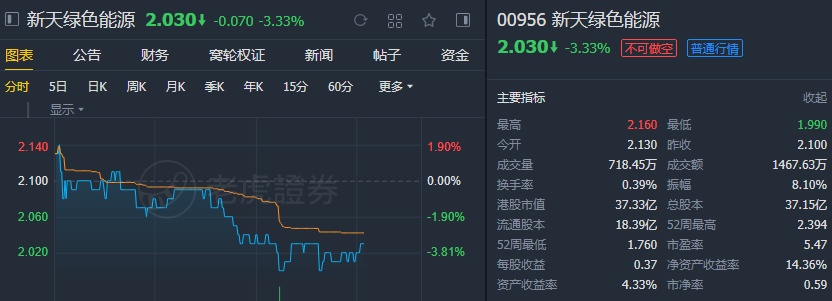 智通财经APP获悉,招银国际发布报告称,公用股的基本因素稳健,受影响较小,防守力较强,推荐新天绿色能源(00956),买入2.08港元,目标价2.35港元,止损1.95港元。