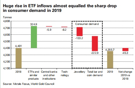 数据显示,2019年全年全球黄金需求同比下降1%至4355.7吨。下半年受到金价走高影响,黄金需求同比下降10%。其中,第四季度总需求同比下降19%,至1045.2吨。金饰和实物金需求是导致同比下降的两个主要因素,这两个因素都对金价上涨作出了反应,其中2019年全年金饰需求同比下降6%至2107吨。以美元价值计算,第四季度的需求下降幅度要小得多,仅下降3%,至497亿美元。