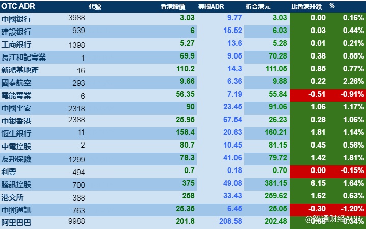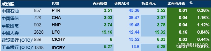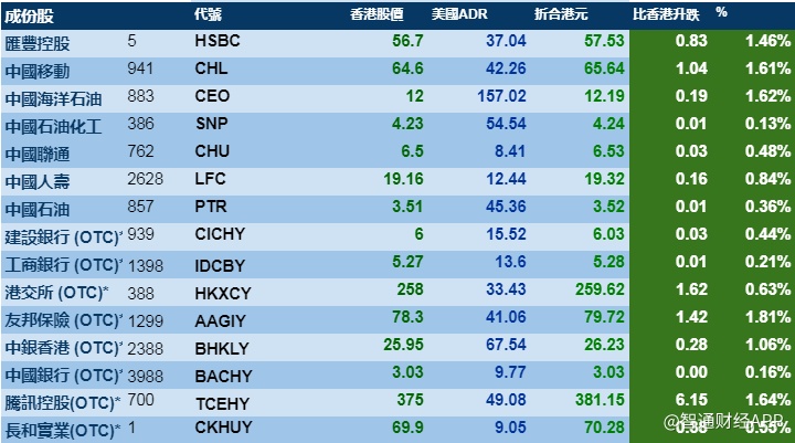 智通财经APP获悉,周四(1月30日),美股先跌后反弹,刺激港股ADR指数全日做好,按比例计算,收报26732点,升283.04点或1.06%。大型蓝筹全线靠稳,汇丰控股收报57.53港元,较港收市升0.83港元;腾讯控股收报381.15港元,较港收市升6.15港元。内银股靠稳,建设银行收报6.03港元,较港收市升0.03港元;工商银行收报5.28港元,较港收市升0.01港元。