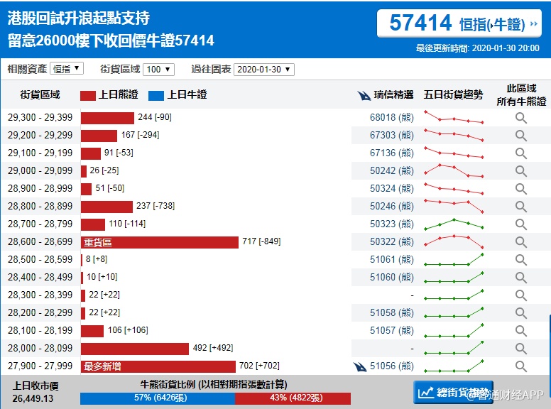 智通财经APP获悉,截至1月30日,恒指最新的牛熊街货比例57:43。瑞信恒指牛熊证街货分布图中的数据显示,熊证街货重货区在28600-28699区间,该区间最新熊证数量为717张,较上一交易日减少849张,最多新增在27900-27999区间,新增702张。牛证街货重货区在25000-25099区间,该区间最新牛证数量为858张,较上一交易日增加68张,最多新增在26200-26299区间,新增185张。